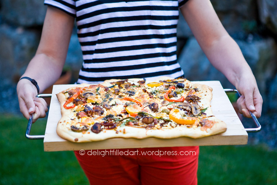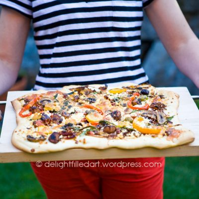 My husband has been enjoying making bread from scratch this year. Our bread machine has taken up residence in a storage container as Curtis kneads, experiments and rests. Most of this goes on while I’m at work, so I cannot comment on his methods, but I’ve gotten to benefit from his labours. We often make our own pizza, because we love having all the toppings we can think up but can’t find in most stores.