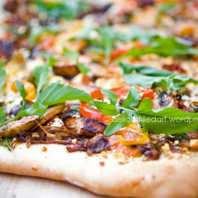 My pizza was based on a favourite combination: garlic base, caramelized onions, sliced figs, anise seeds. I also added some cooked vegetables and a few pieces of chicken, black olives, sun-dried tomatoes, feta and fresh arugla from the garden.