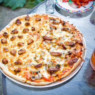 The kids’ half was their favourite: Chicken & cheese on a garlic base. The other half of the round pizza was my husband’s, with tomato sauce and mainly roasted vegetables and cheese.